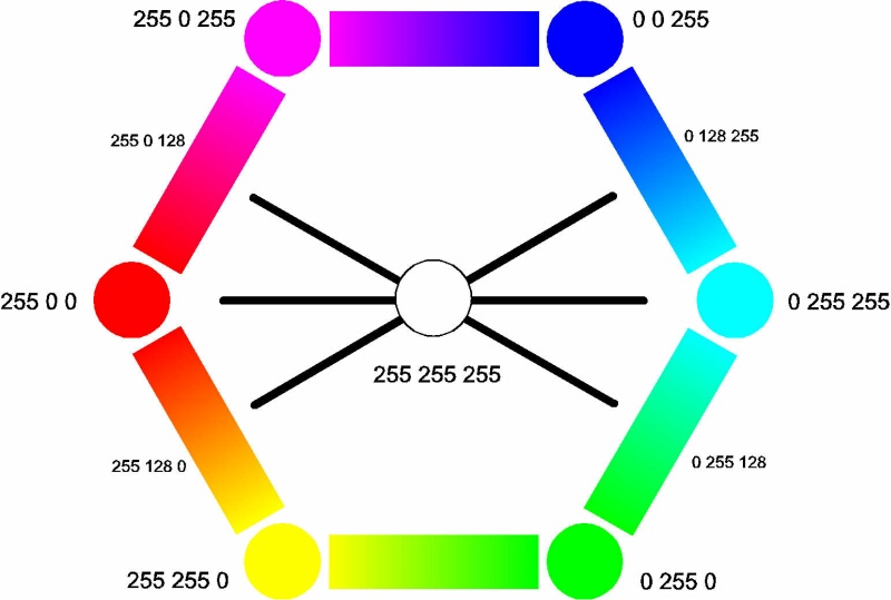 Die Farbdarstellung für Monitorbilder erfolgt durch einen 3-dimensionalen Farbvektor mit den Farbrichtungen rot, grün und blau. Für jede dieser Farben kann durch einen Zahlenwert zwischen 0 (kein Farbanteil) und 1 (100%iger Farbanteil) angegeben werden, wie hoch der Anteil der entsprechenden Farbe sein soll. Für viele Zwecke ist eine Auflösung von 8 Bit je Grundfarbe ausreichend, so dass häufig die Farbwerte auch durch ganze Zahlen zwischen 0 und 255 dargestellt werden (wie auch im dargestellten Farbkreis). Also wird die Farbe Rot durch das Zahlentripel (255 0 0), die Farbe Grün durch das Tripel (0 255 0) und die Farbe Blau durch (0 0 255) dargestellt. Die "Farbe" Schwarz besitzt keinerlei Farbanteile (0 0 0), die "Farbe" Weiß dagegen volle Farbanteile aller 3 Grundfarben (255 255 255). Sie können das in dem folgenden Farbwähler selbst ausprobieren (benötigt JavaScript).