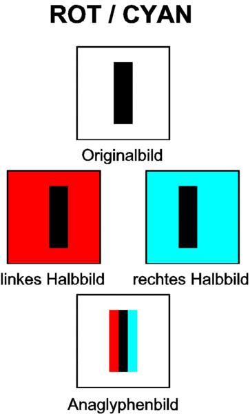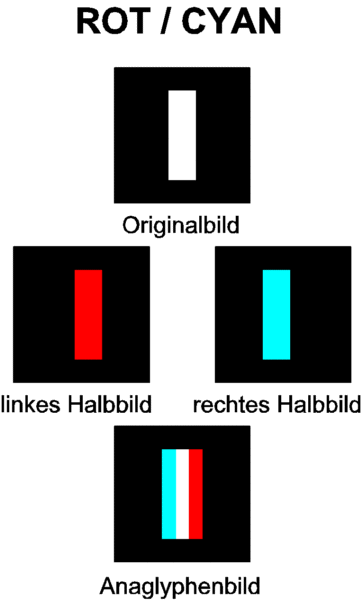 Dieses Bild zeigt oben einen dunklen Balken vor hellem Hintergrund. In der mitteleren Reihe den rot eingefärbten Grauwert für das linke Halbbild und den cyan eingefärbten Grauwert für das rechte Halbbild (schwarz besitzt den Grauwert null und bleibt somit schwarz). Unten ist in diesem Bild die additive Farbüberlagerung beider Bilder, also das fertige Anaglyphenbild zu sehen. Der Hintergrund ist wieder weiß, weil rot und cyan Komplementärfarben sind. (Für ein größeres Bild bitte auf die Grafik klicken!)