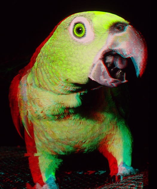 | Papagei Robi. Anaglyphenbild mit optimalen Farben ohne Kompromisse bei der Farbtrennung. Cosimaparameter: AnaglyphType = 3. |