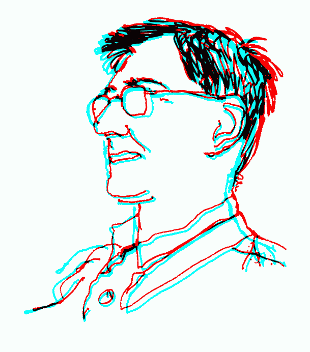 | Porträt Gerhard P.Herbig, gezeichnet von Sylvain Arnoux. Reine rot/cyan Farben zum Betrachten auf dem Monitor mit rot/cyan-Brille. Die Durchlaßbedingung ist auf dem Monitor immer perfekt erfüllt. Das Ergebnis ist nur noch von den Farben des Monitors und der Sperrfähigkeit der Brille abhängig. |